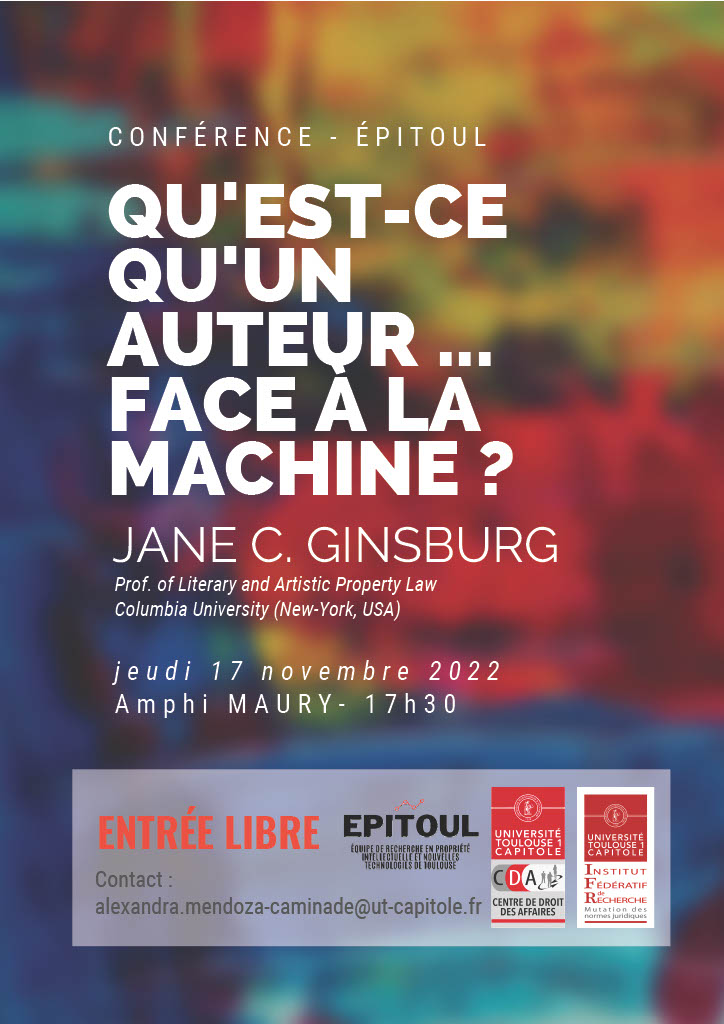 La conférence portera sur l’impact de la création réalisée par l’intelligence artificielle en matière de droit d’auteur : tout d’abord du point de vue de l’œuvre de l’esprit, puis au regard de la relation entre l'auteur personne physique et la machine. Jane C. Ginsburg est professeur de droit à l’université Columbia de New York où elle enseigne le droit de la propriété littéraire et artistique. A l’université Toulouse Capitole, elle enseigne le droit du Copyright dans le Master Droit de la propriété intellectuelle et donne régulièrement des conférences dans le cadre de l’équipe EPITOUL spécialisée en IP/IT du Centre de Droit des Affaires.
