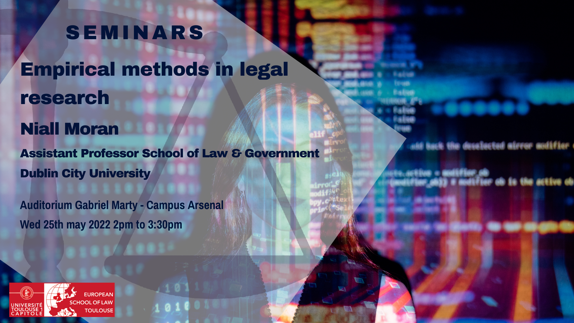 As part of its Franco-Irish academic cooperation, the European School of Law Toulouse is honoured to welcome Professeur Niall Moran, associate Professor at Dublin City University, for a seminar on Research Design and Empirical Methods in Law.
