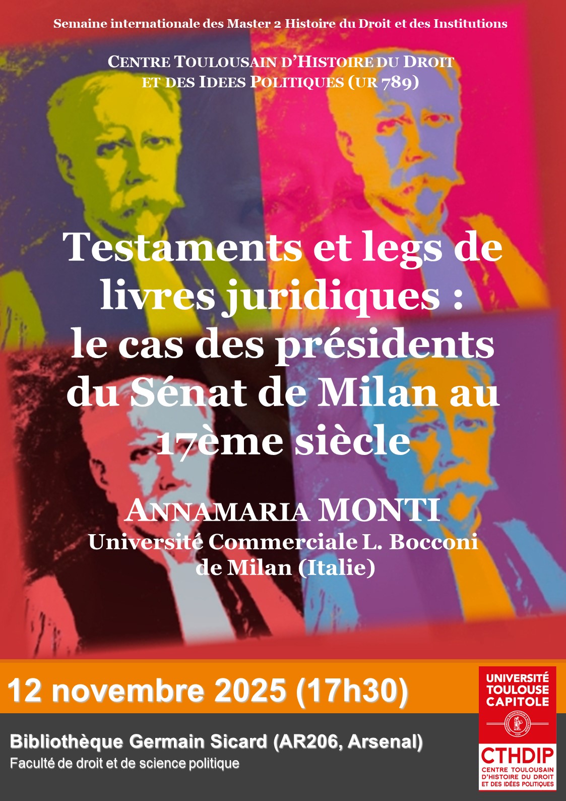 "Testaments et legs de livres juridiques : le cas des présidents du Sénat de Milan au 17ème siècle", conférence doctorale d'Annamaria Monti organisée par le CTHDIP