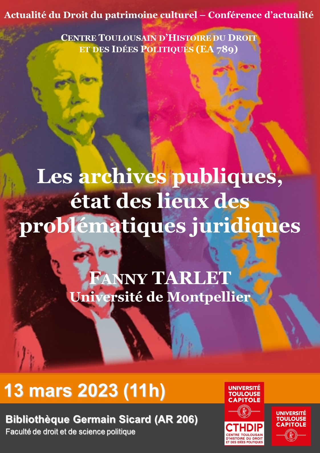 "Les archives publiques, état des lieux des problématiques juridiques", conférence d'actualité en droit du patrimoine culturel donnée par Madame Fanny Tarlet (professeur de droit public à l'Université de Montpellier) pour le Master 2 Histoire du Droit et des Institutions.