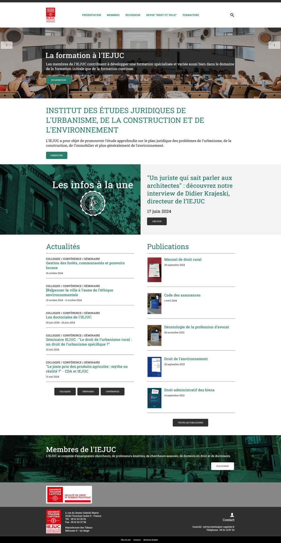 L'Université Toulouse Capitole est fière d'annoncer le lancement du nouveau site internet de l'Institut des Études Juridiques de l'Urbanisme, de la Construction et de l'environnement (IEJUC), rattaché à la Faculté de Droit et Science politique. Une belle vitrine pour le laboratoire de recherche créé en 1954.
