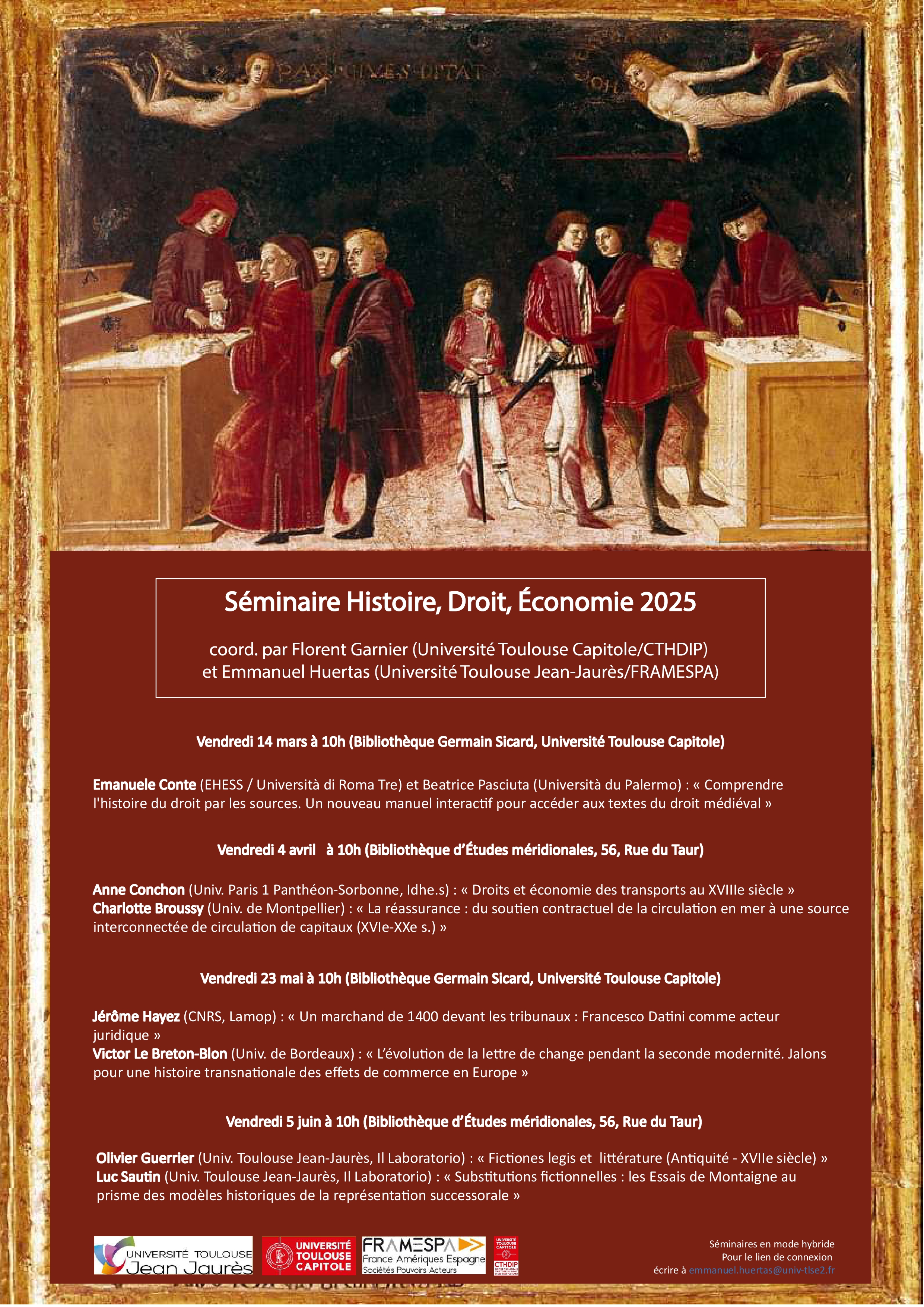 Le Centre Toulousain d’Histoire du Droit et des Idées Politiques (Université Toulouse Capitole) et le laboratoire FRAMESPA (Université Toulouse Jean-Jaurès) présentent le Séminaire Histoire Droit Économie. Ce séminaire a pour objet d’inviter des historiens ou des historiens du droit afin de présenter des travaux ayant une dimension économique et juridique dans la longue durée (Moyen Âge – époque moderne). Une attention particulière est donnée aux typologies documentaires et à la présentation des corpus de sources. L’approche est interdisciplinaire destinée à renforcer le dialogue scientifique entre chercheurs d’établissements toulousains dans une dimension européenne et internationale.