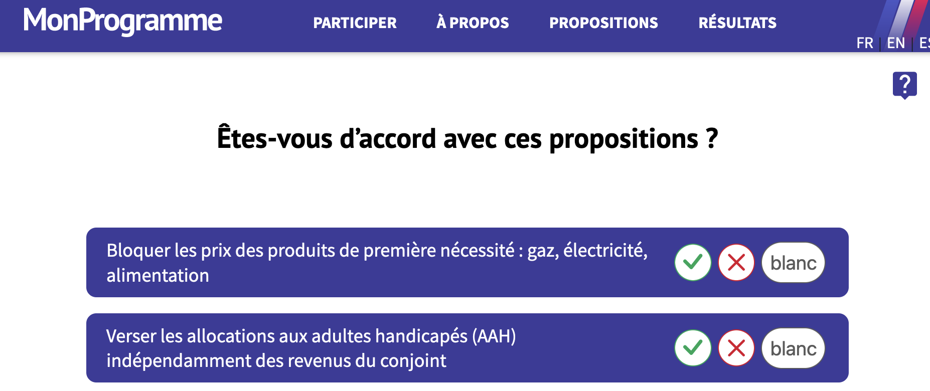 Monprogramme2022.org est un exercice collaboratif simple qui permet aux utilisateurs non seulement de construire leurs propres programmes gouvernementaux, mais aussi d'identifier les points d'accord et de désaccord avec les autres participants.