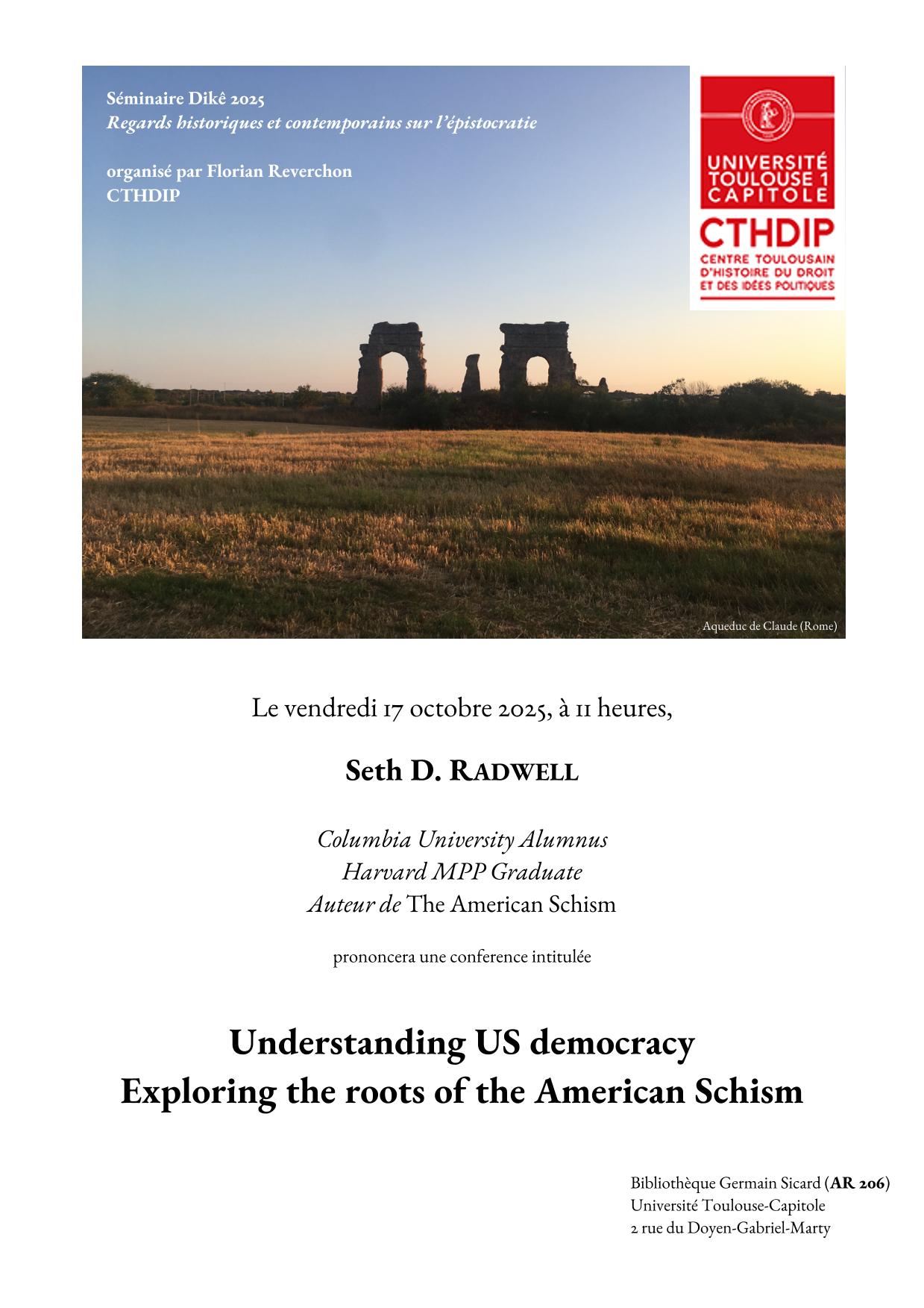 Le vendredi 17 octobre, à 11 heures en salle AR 206, Seth David Radwell, auteur du livre American Schism, paru il y a quelques années aux États-Unis, viendra prononcer une conférence avec le titre suivant : Understanding US democracy. Exploring the roots of the American Schism.