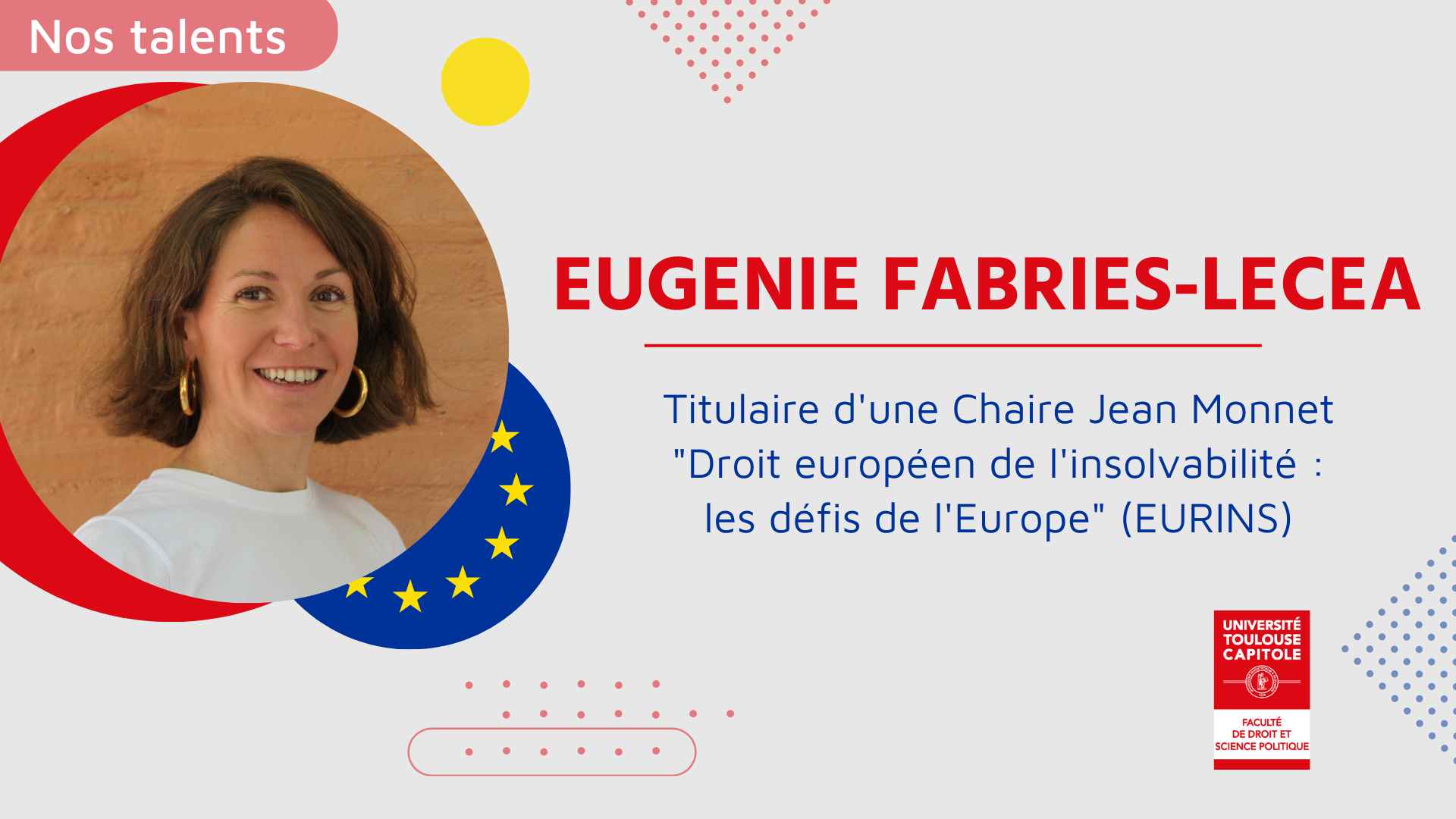 Depuis le 6 juillet, Madame Eugénie Fabriès-Lecea, Maître de conférences en Droit privé et Sciences criminelles à l'Université Toulouse Capitole, est titulaire d'une Chaire Jean Monnet en Droit européen de l'insolvabilité, pour une durée de 3 ans.