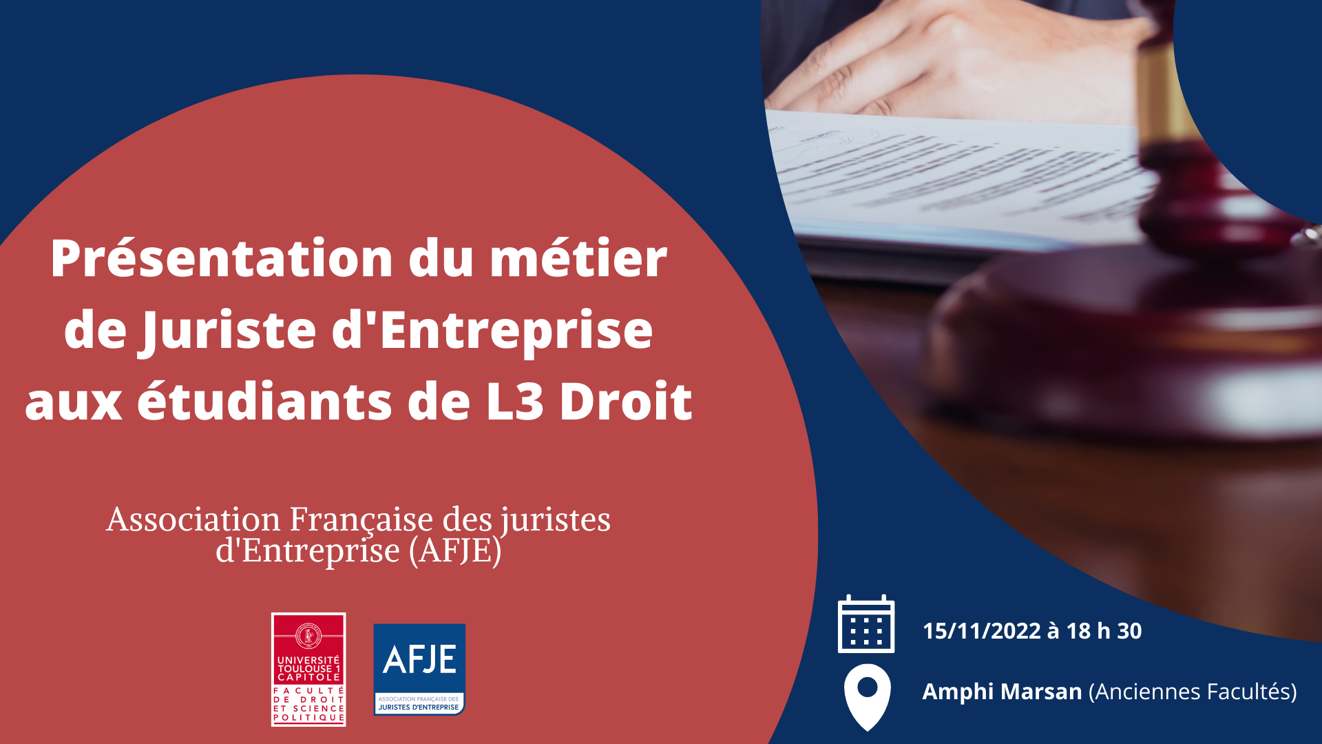 La Faculté de droit de Toulouse a le plaisir d'accueillir, mardi 15 novembre à 18 h 30 à l'amphi Marsan, l'AFJE pour une présentation du métier de Juriste d'entreprise, 2eme profession du droit après le métier d'avocat.