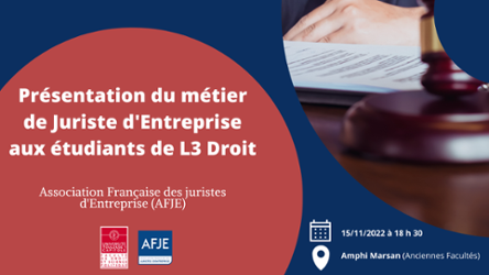 L'Association Française des Juristes d'Entreprises (AFJE) présentera mardi 15 novembre le métier de Juriste d'entreprise et ses évolutions aux étudiants de Licence 3 Droit.