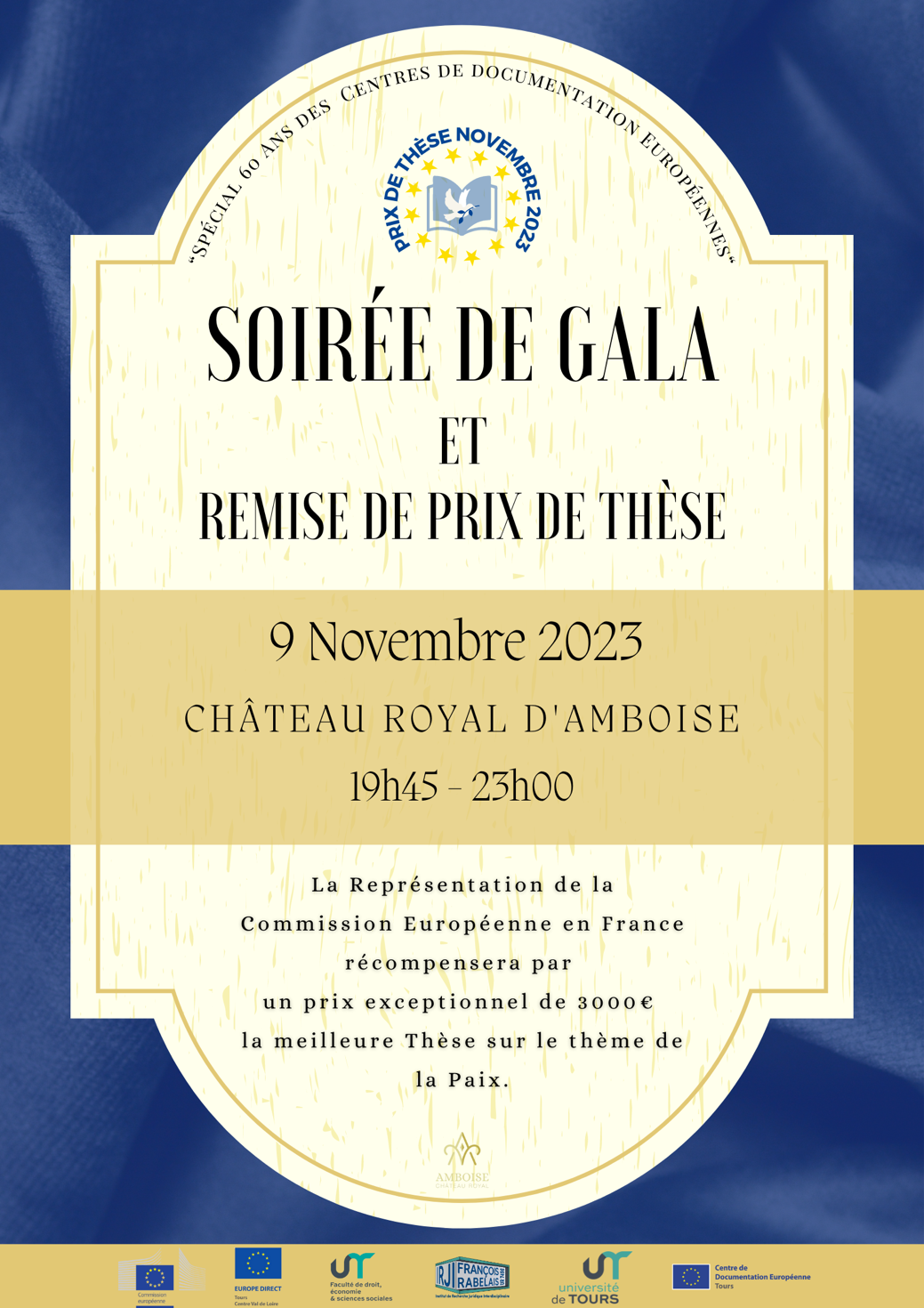 Lors de la célébration des 60 ans des Centres de documentation européenne (CDE) qui s'est tenue à Tours le 8 novembre 2023, un colloque consacré à la paix en Europe a eu lieu les 9 et 10 novembre. Dans le cadre de cet événement, un prix de thèse exceptionnel de la Commission européenne a été proposé et décerné le 9 novembre lors de la soirée de gala au Château d’Amboise. Un représentant de la Commission européenne a eu le privilège de remettre ce prix.