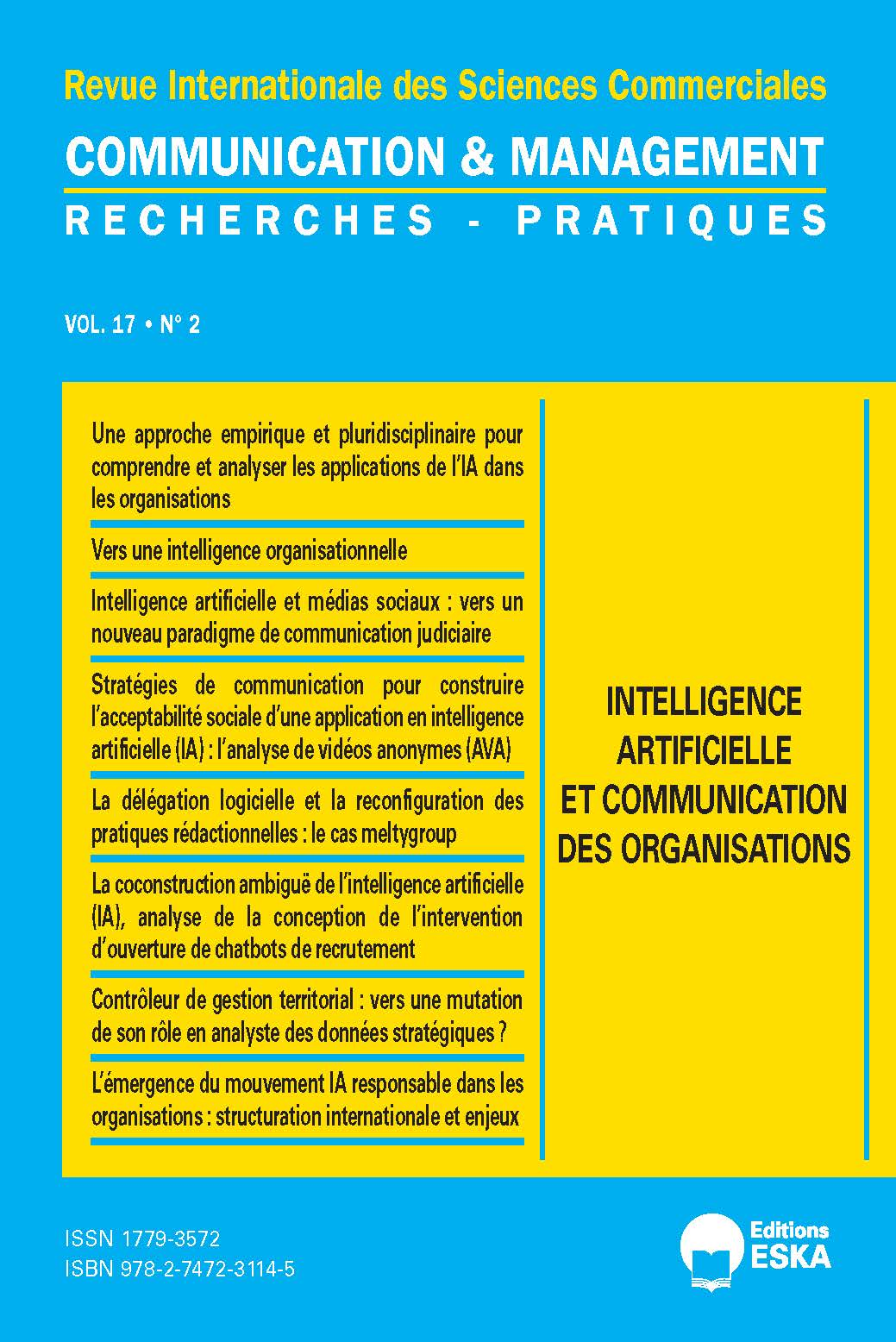 Ce numéro a été coordonné par Christophe Alcantara ( MCF HDR, IDETCOM, UT1 Capitole) , Francine Charest et Alain Lavigne, professeurs titulaires de communication de l'Université Laval de Québec. Il interroge de façon pluridisciplinaire le phénomène de l'IA dans les organisations avec des articles relevant du droit, des sciences de gestion, des SIC et de l'informatique. Il est à noter que Daniel Pélissier, également enseignant-chercheur rattaché à l'IDETCOM est publié dans ce numéro thématique".