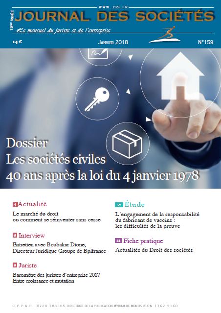 vient de paraître dans la revue Journal des Sociétés, N° 159, janvier 2018, dirigée par Deen Gibirila, Professeur émérite à l'Université Toulouse 1 Capitole et directeur scientifique de cette revue.
