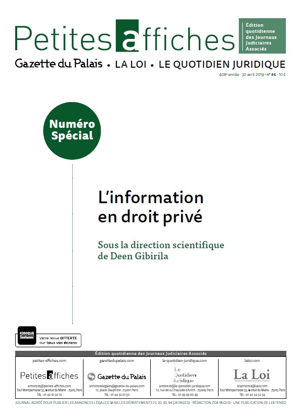 "L'information en droit privé", sous la direction scientifique de Deen GIBIRILA - Édition quotidienne des Journaux Judiciaires Associés - Numéro spécial du 30 avril 2019