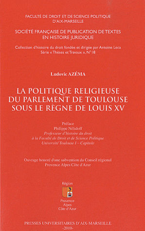 Ludovic AZEMA, La politique religieuse du Parlement de Toulouse sous le règne de Louis XV, Presses universitaires d'Aix-Marseille, 2010, n° 18, 307 p.