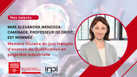 Nommée par la Ministre de l'ESR, Madame Alexandra Mendoza-Caminade, professeur en Droit privé et Sciences criminelles à l'Université Toulouse Capitole, est membre titulaire du jury français d'examen de qualification en propriété industrielle pour la profession de Conseil en Propriété Industrielle – mention Brevets d’invention.