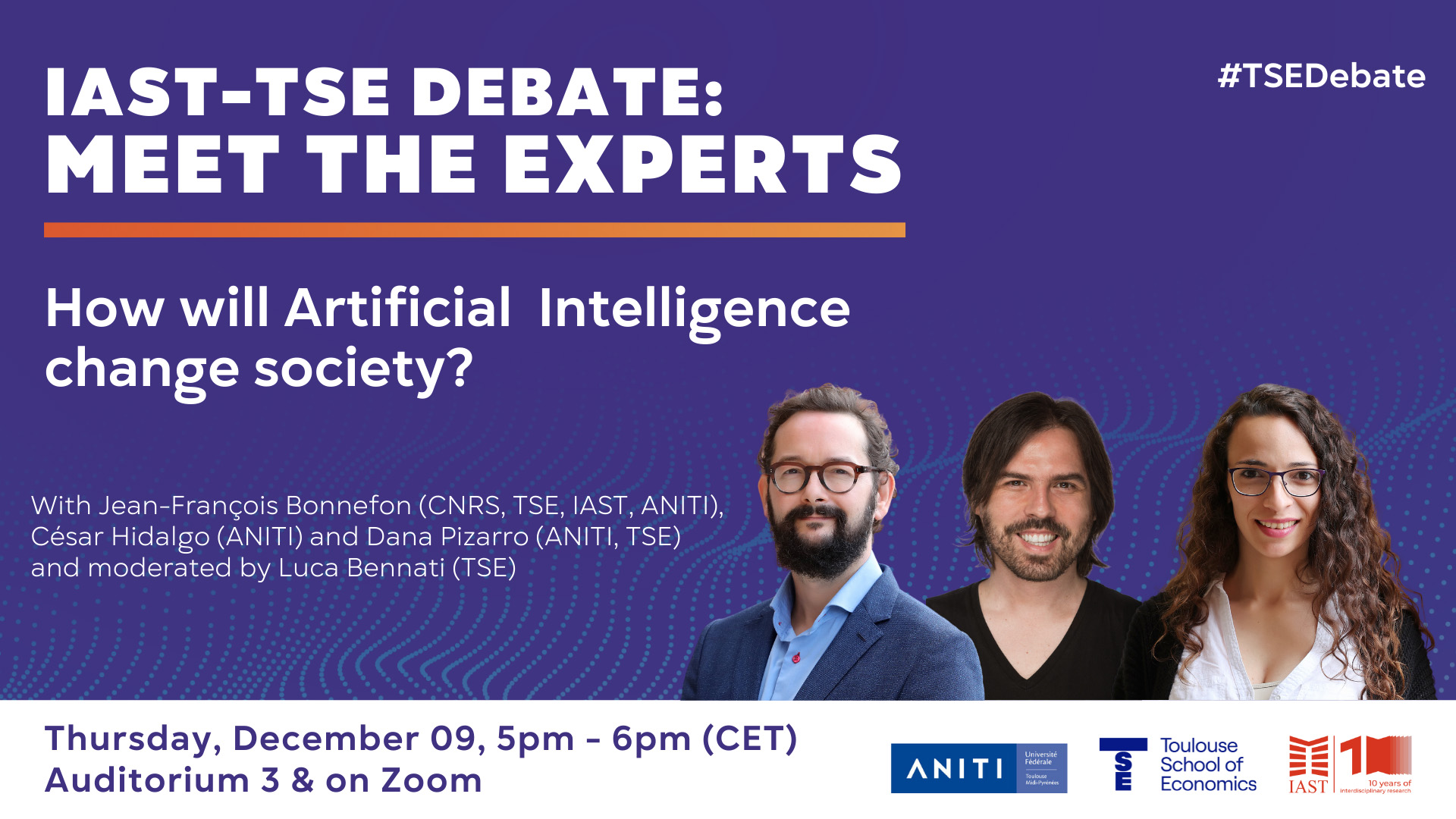 Jean-François Bonnefon (chercheur IAST-TSE ) discutera de la manière dont l'AI soulèvera de nouvelles questions et des problèmes éthiques. César Hidalgo (chercheur TSE, membre d'ANITI) développera son point de vue sur la façon dont les humains perçoivent les machines et comment l'apprentissage automatique peut améliorer la démocratie, l'économie. Dana Pizarro (TSE post doctorate) expliquera la façon dont l'AI fonctionne pour la fixation des prix, sur le moyen des consommateurs de s'adapter et sur ce que l'essor de l'IA signifiera pour l'économie.