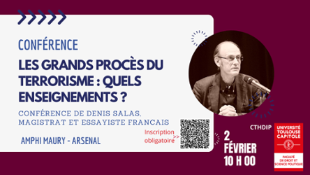 La Faculté de droit de Toulouse a le plaisir d'organiser, en collaboration avec le Centre Toulousain d'Histoire du Droit et des Idées Politiques (CTHDIP), une conférence exceptionnelle donnée par Denis Salas, Magistrat et essayiste français.
