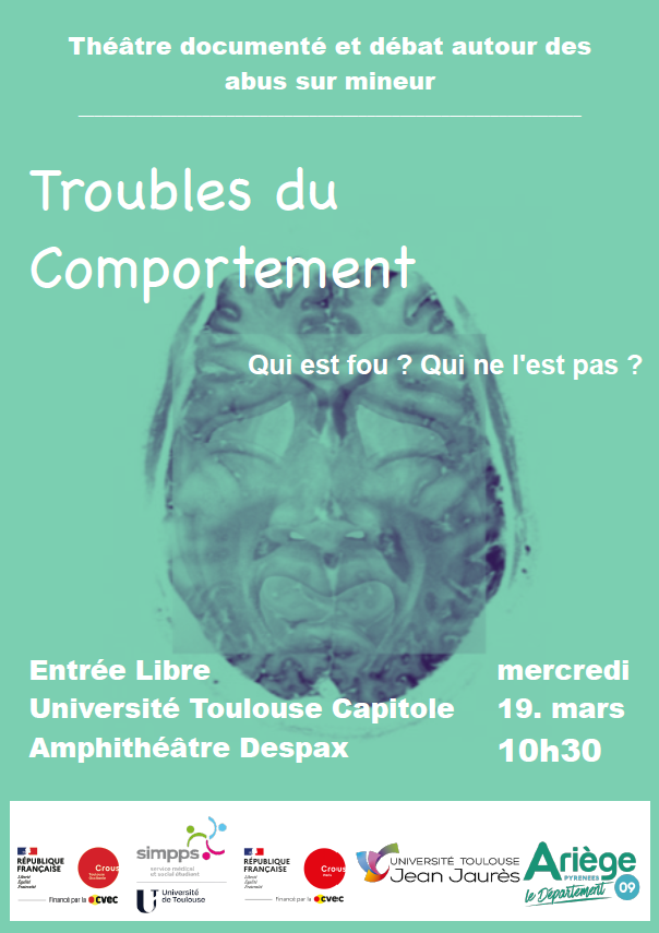 Venez assister le 19 mars à Troubles du comportement, un spectacle de théâtre documenté sur les abus sur mineur, suivi d'un débat en présence d'Isabelle Peyrieras-Roche, éducatrice spécialisée en protection de l'enfance, et Lycette Corbion, maîtresse de conférence en droit privé et chargée de mission égalité à UT Capitole. Qui est fou ? Qui ne l’est pas ? La vérité tapie au fond du puits mène à la folie, au suicide... Que sont “ces troubles du comportement” diagnostiqués à ceux ou celles qui osent une parole ?