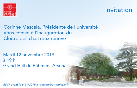 Corinne Mascala, Présidente de l'université, vous convie à l'inauguration du cloître des Chartreux réhabilité : mardi 12 novembre 2019 - 19 h, dans le grand hall du bâtiment Arsenal.