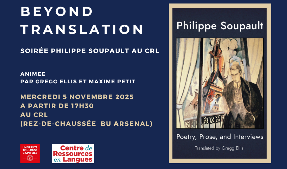 Le Centre de Ressources en Langues a le plaisir d'inviter toute la communauté UT Capitole le 5 novembre 2025 à une soirée d'échanges co-animés par Gregg Ellis et Maxime Petit autour du poète Philippe Soupault.