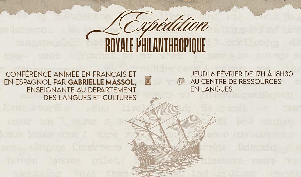 Le Centre de Ressources en Langues propose à l'ensemble de la communauté UT Capitole une conférence animée par Gabrielle Massol, le jeudi 6 février à partir de 17h : "L'Expédition royale philanthropique".