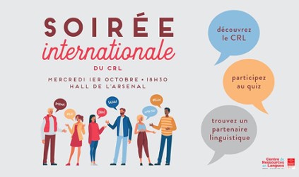 Le mercredi 1er octobre 2025, le Centre de Ressources en Langues organise une "Soirée internationale" dans le Grand Hall de l'Arsenal. Venez dès 18h30 pour participer aux jeux et tenter de gagner des prix, pour découvrir le CRL et rencontrer des partenaires linguistiques !