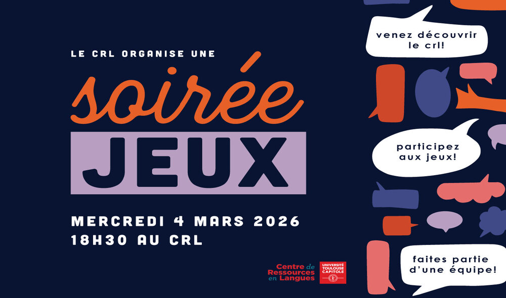 Les étudiants médiateurs linguistiques au Centre de Ressources en Langues proposent à tous les étudiants curieux de l'Université Toulouse Capitole de venir découvrir l'espace et les ressources du CRL, le temps d'une Soirée Jeux le mercredi 4 mars 2026.