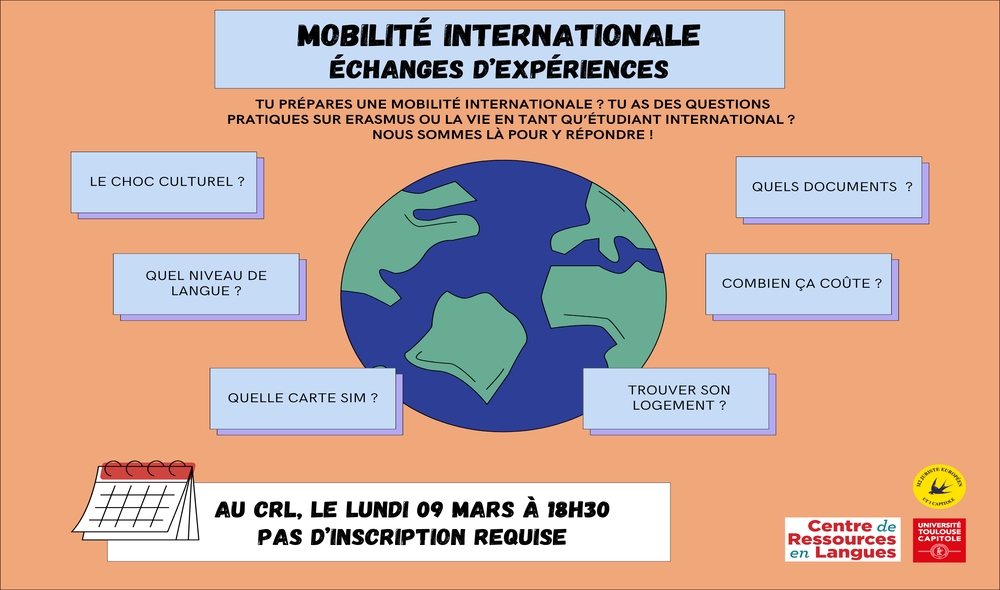 Venez au CRL pour préparer votre mobilité à l'international en échangeant avec des étudiants de master 2 qui en ont déjà fait l'expérience, le lundi 9 mars à 18h30.