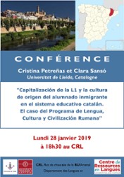 "Capitalización de la L1 y la cultura de origen del alumnado inmigrante en el sistema educativo catalán. El caso del Programa de Lengua, Cultura y Civilización Rumana", conférence proposée par le DLC