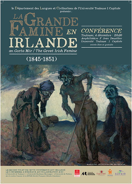 Après avoir organisé le colloque annuel de la Société Française d'Etudes Irlandaises, le Département des Langues et Civilisations poursuit son exploration de l'Irlande et organise jeudi 4 décembre, amphi F. Dauvillier à 15h30, une conférence sur « La Grande Famine en Irlande ». Cette question, qui est notamment au programme de l'agrégation d'anglais cette année, est l'occasion pour l'Université Toulouse I Capitole de recevoir deux grands spécialistes irlandais de la question, Cormac Ó Gráda et Niall Ó Ciosáin, qui apporteront leur éclairage sur cette question et répondront à vos questions. Cette conférence est ouverte à tous.
