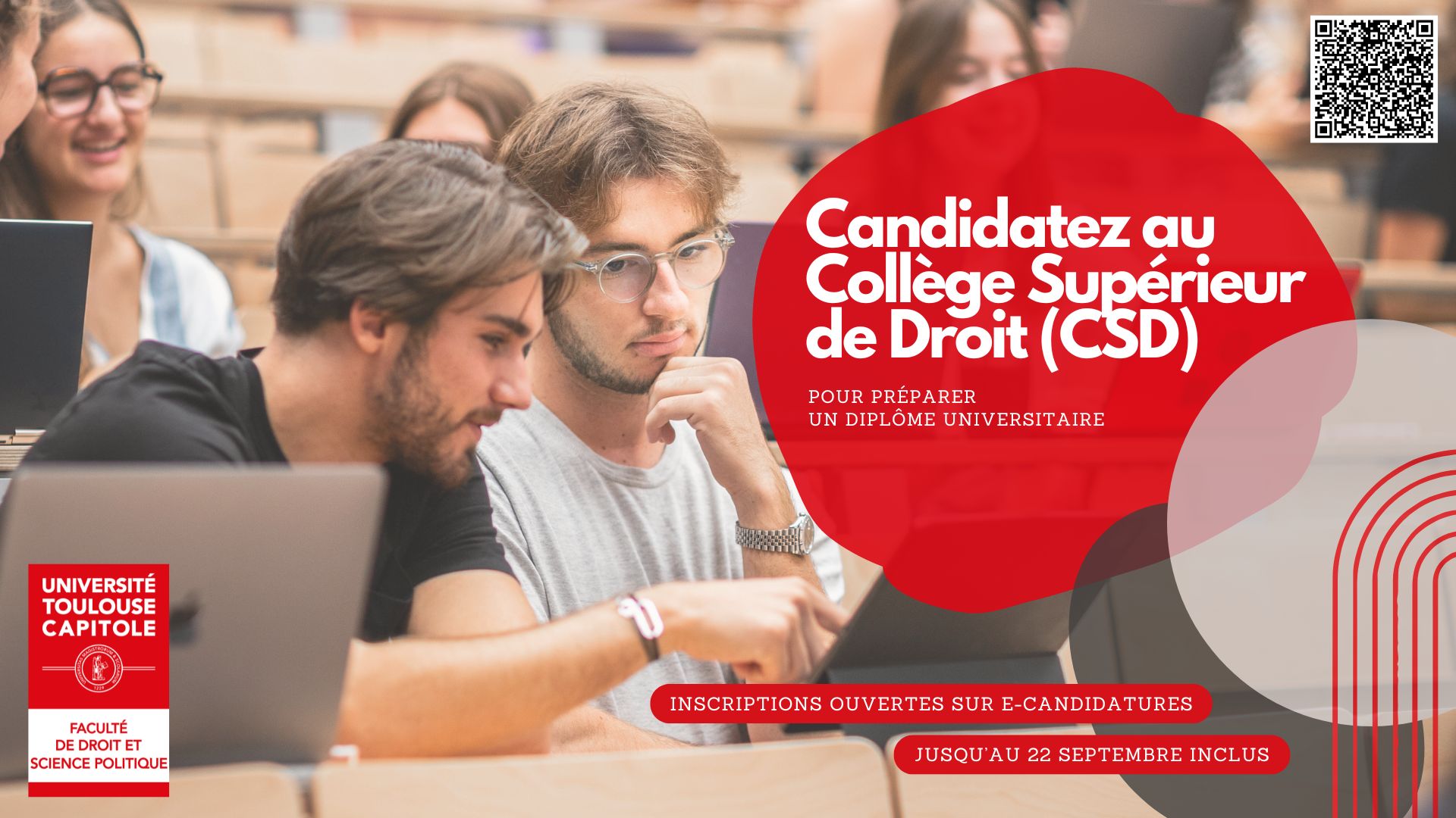 La campagne d'inscription au Collège Supérieur de Droit (CSD) est ouverte pour l'année 2024/2025. Candidatez sur e-Candidatures jusqu'au 22 septembre !