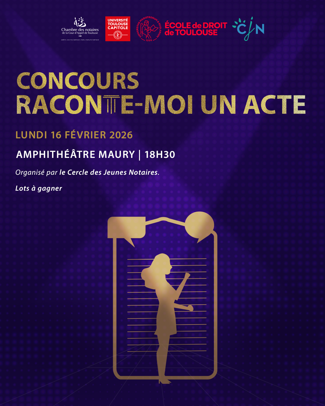 Un concours sur le thème du notariat intitulé "RACONTE-MOI UN ACTE" sera organisé le lundi 16 février à 18h30, en amphi Maury dans le cadre de la Fête du droit, organisé par le Cercle des Jeunes Notaires.