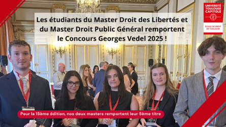La 15ème édition du prestigieux concours Georges Vedel 2025 s’est tenue cette année, réunissant les meilleurs équipes étudiantes autour d'un exercice de plaidoirie de droit constitutionnel. Pour la deuxième année consécutive, l'École de Droit de Toulouse décroche son 5ème titre depuis la création du concours.