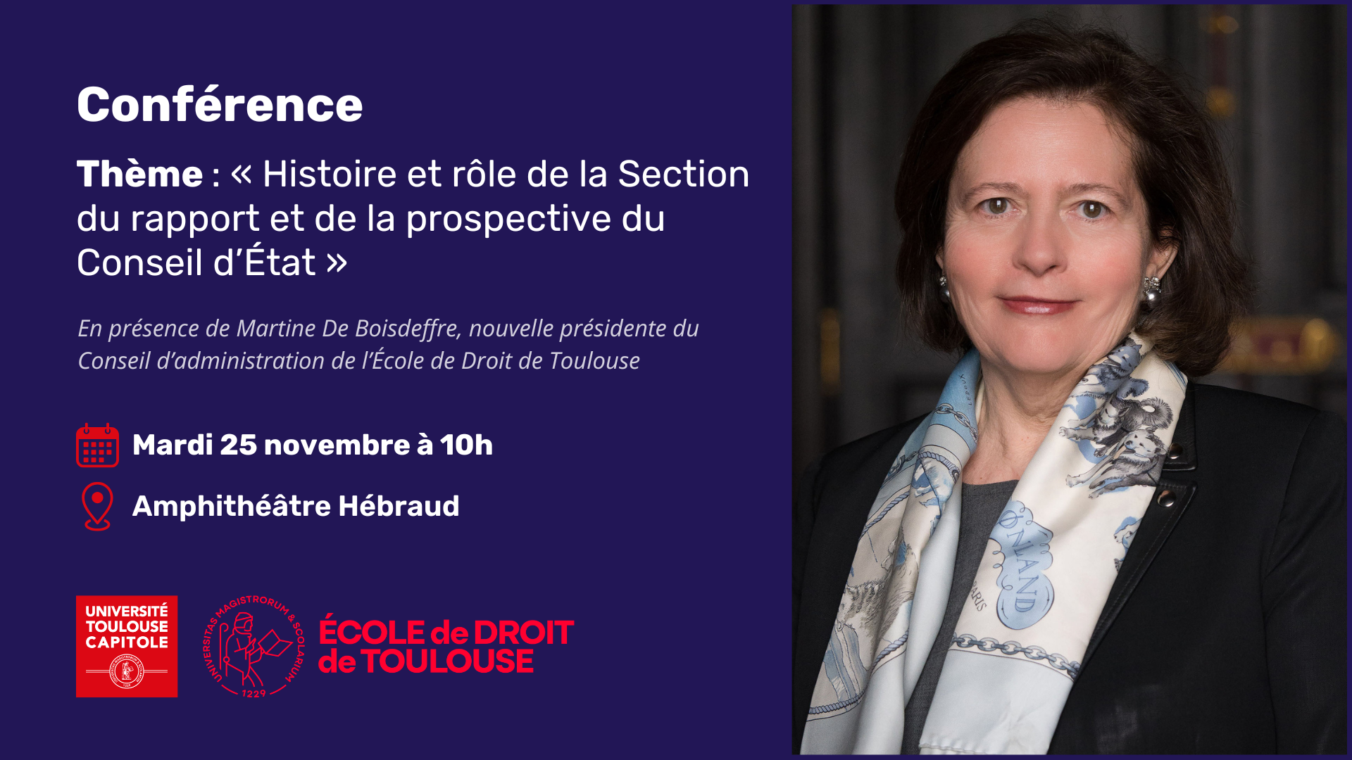 A l'occasion de sa prise de fonction au sein du conseil d'administration de l'École de Droit de Toulouse, la nouvelle présidente du conseil assurera une conférence sur le thème : « Histoire et rôle de la Section du rapport et de la prospective du Conseil d’État ».