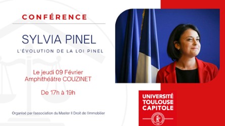 Organisée par l’association des étudiants du Master II Droit de l’immobilier, sous la direction du Directeur de Master M. Thioye, cette conférence portera sur le dispositif de défiscalisation initié par la loi Pinel, de sa création en 2014 à sa prolongation jusqu’en 2024. Les effets du dispositif ainsi que ses évolutions seront présentés par la Ministre Sylvia Pinel en personne.
