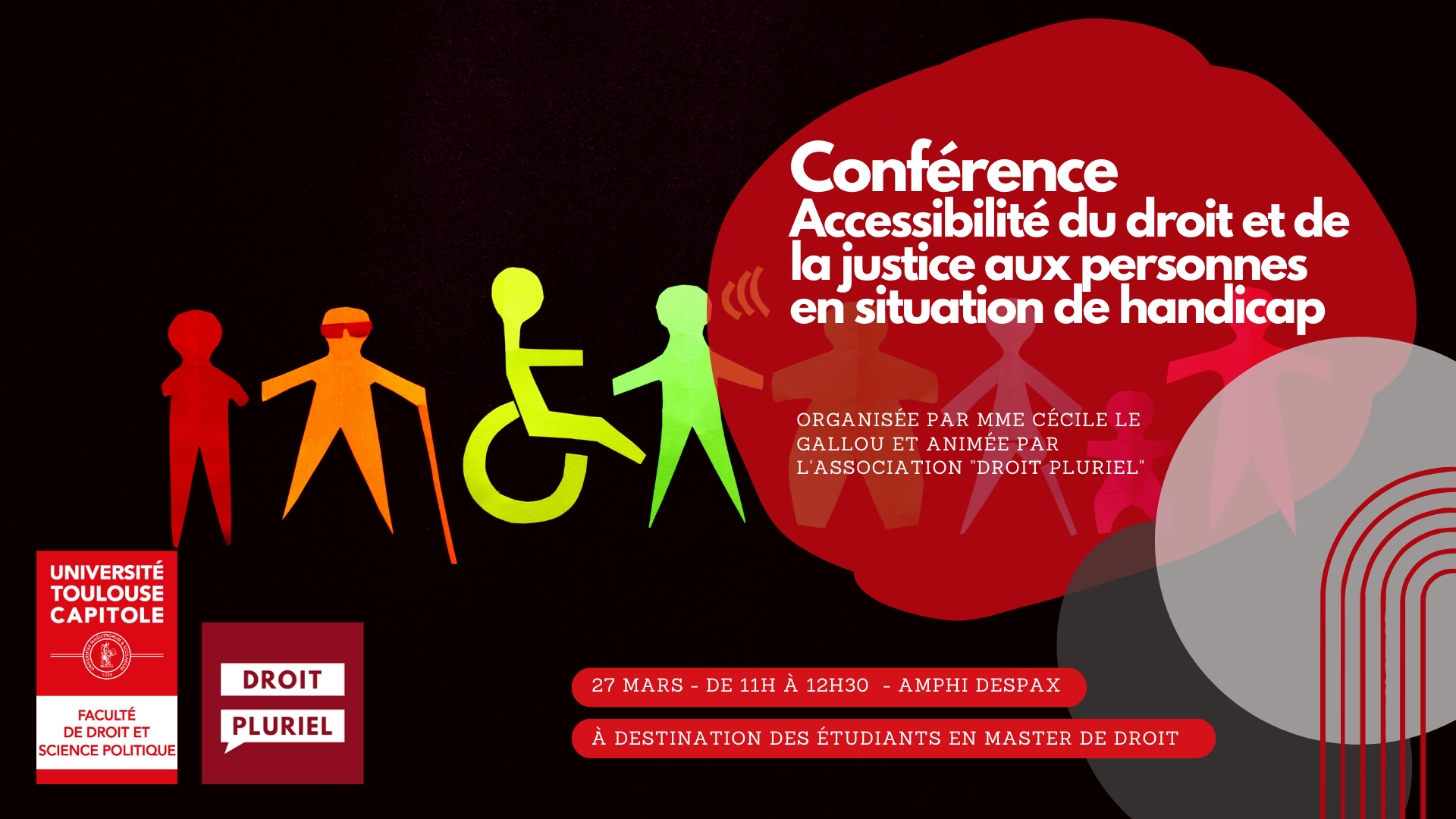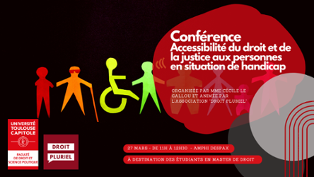 Mme Cécille Le Gallou, Professeur de droit et chargée de mission handicap-inclusion, organise une conférence de sensibilisation aux handicaps à destination des étudiantes et étudiants en Master de droit. La conférence sera assurée par l'association "Droit pluriel".