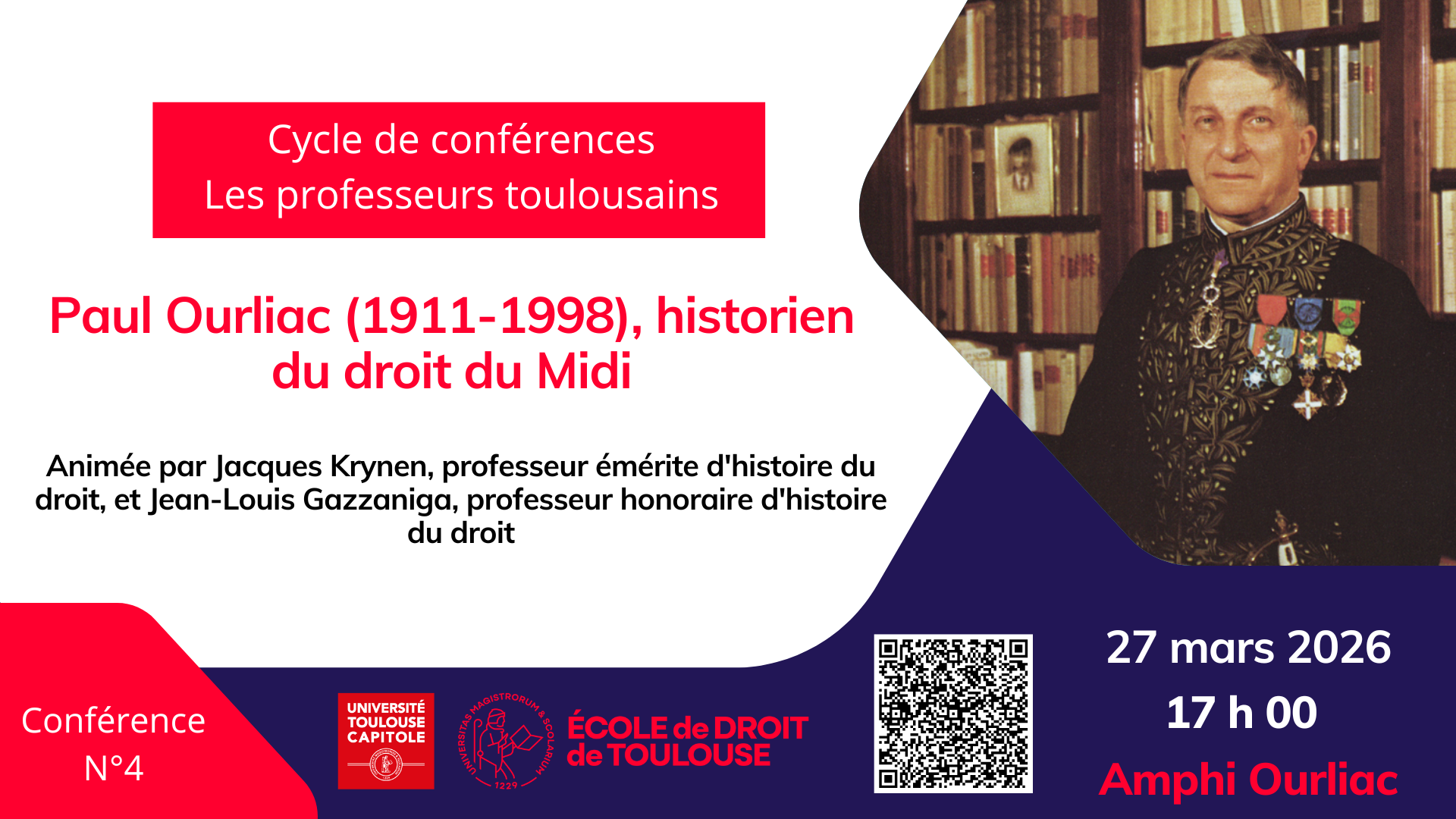 Cette troisième conférence sera consacrée à Paul Ourliac (1911-1998), historien du droit du Midi. Elle sera animée par Jacques Krynen, professeur émérite d'histoire du droit, et Jean-Louis Gazzaniga, professeur honoraire d'histoire du droit .