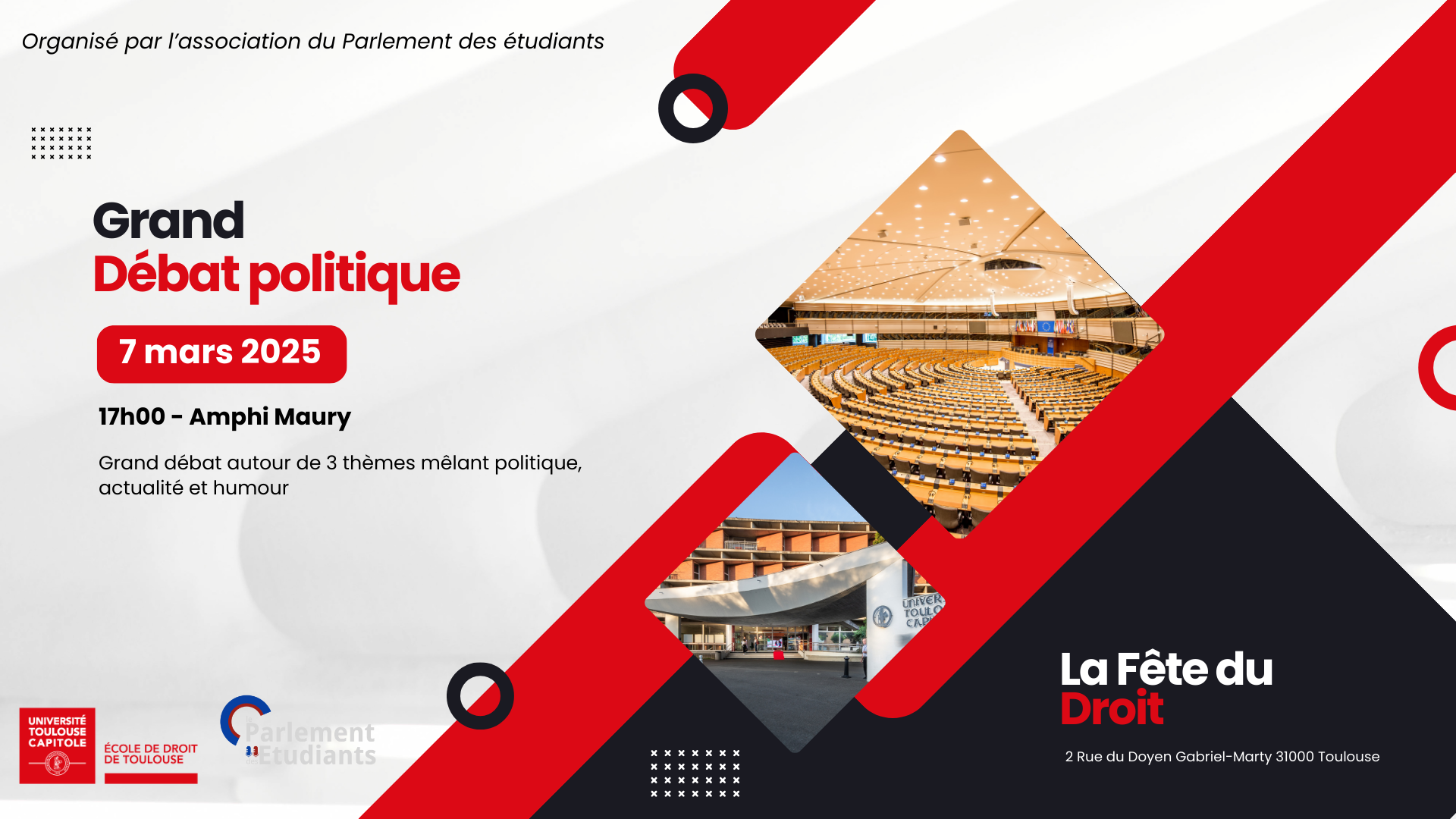 Dans le cadre de la Fête du droit qui se déroulera du 5 au 11 mars à l'université, l'École de droit de Toulouse organise une série d'événements pour fêter le Droit. Un grand débat politique, organisé par l'association du Parlement des étudiants aura lieu le 7 mars.