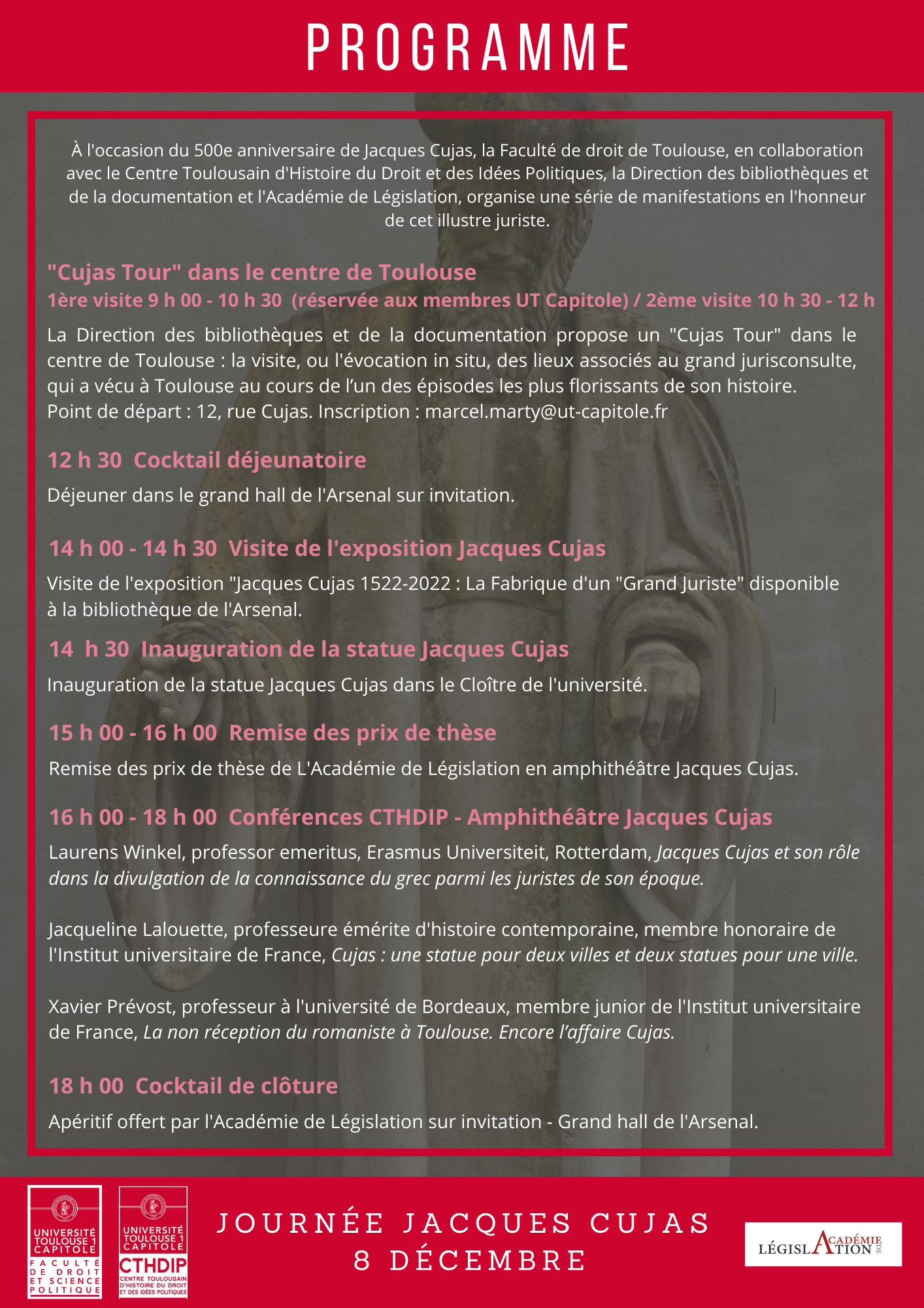 À l'occasion du 500e anniversaire de la naissance du grand juriste Toulousain Jacques Cujas, la Faculté de droit de Toulouse, en collaboration avec le Centre Toulousain d'Histoire du Droit et des Idées Politiques (CTHDIP), la Direction des bibliothèques et de la documentation et l'Académie de Législation, organise une série de manifestations en l'honneur de cet illustre juriste.