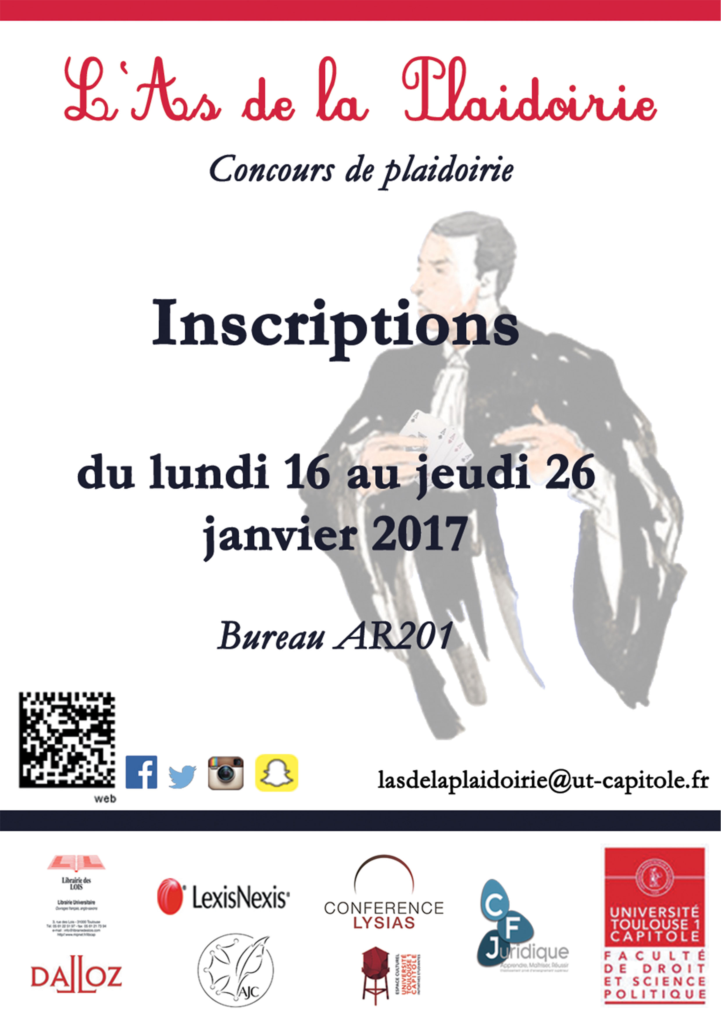 Inscriptions du 16 janvier au 26 janvier 2017 Dépôt du dossier comprenant la fiche d'inscription (à télécharger dans l'encadré à droite de cette page), une lettre de motivation et le règlement du concours daté et signé auprès de Monsieur Rachid El Maalem (Bureau AR201 – bât. Arsenal, 2ème étage, direction « Faculté de droit ») La liste des candidats sélectionnés sera diffusée sur Moodle.