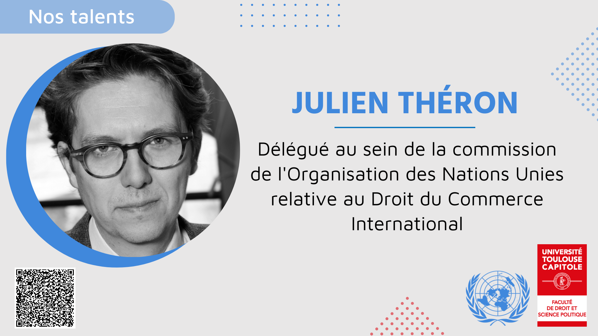 Depuis le mois d'avril dernier, Monsieur Julien Théron, Professeur en Droit privé et Sciences criminelles à l'Université Toulouse Capitole, a été désigné délégué au sein de la Commission de l'Organisation des Nations Unies relative au Droit du Commerce International.