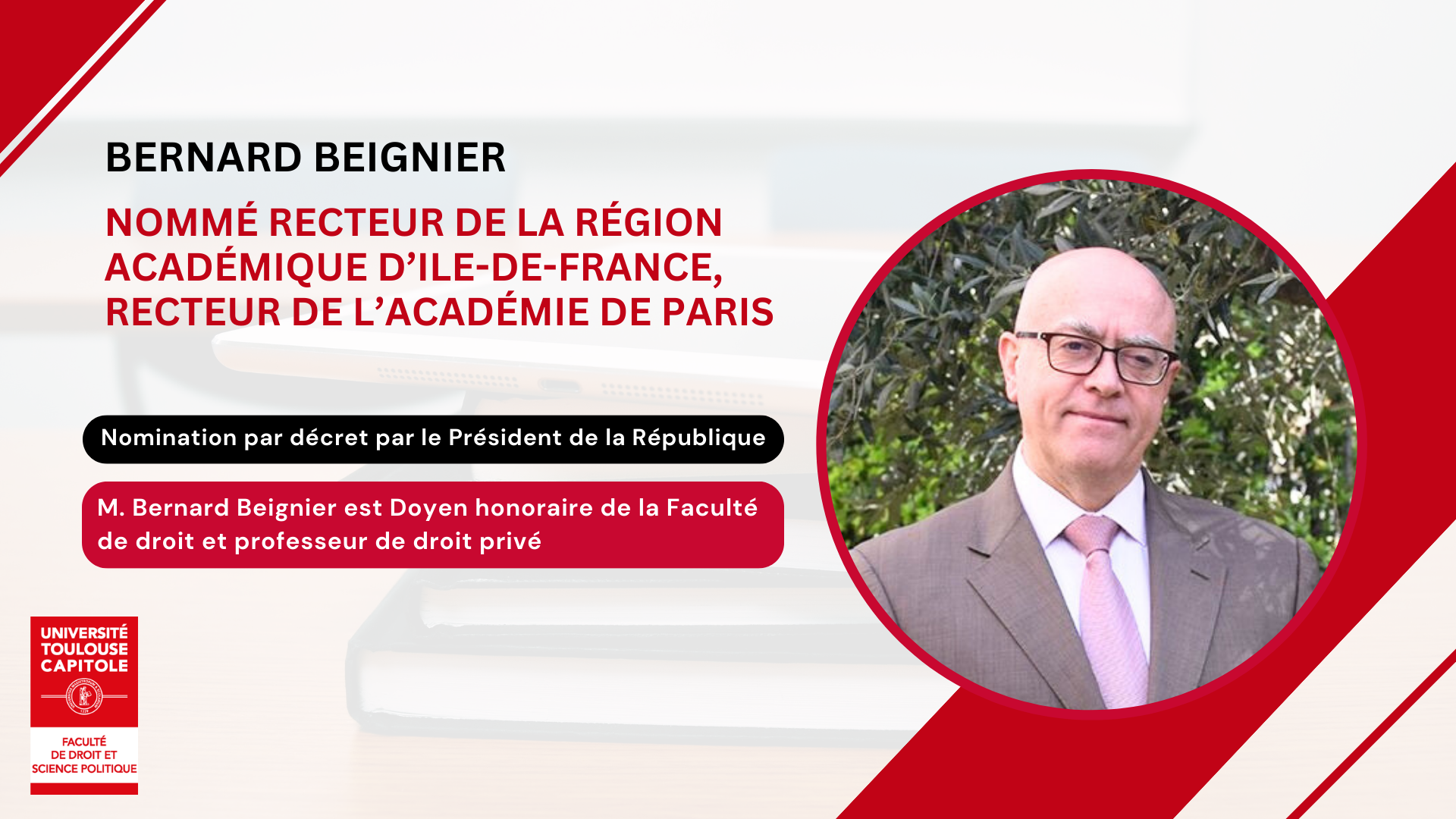 Monsieur Bernard Beignier, Doyen honoraire de la Faculté de Droit de Toulouse et Professeur agrégé de droit privé et sciences criminelles, a été nommé, le 03 avril 2024 par le Président de la République (par décret pris en conseil des ministres), Recteur de la région académique d'Ile-de-France, Recteur de l’académie de Paris, en remplacement de M. Christophe Kerrero. Il portera également le titre de chancelier des universités.