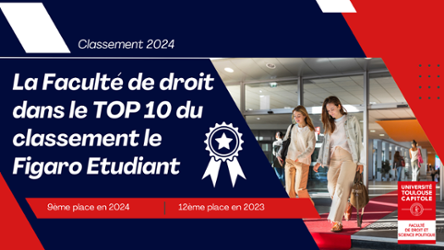 Le Figaro Étudiant vient de dévoiler son classement annuel des meilleures Facultés de droit en France pour la deuxième année consécutive, et la Faculté de droit de l'Université Toulouse Capitole a accompli un bond significatif en se hissant à la 9ème place, marquant ainsi son entrée dans le Top 10 pour l'année 2024.