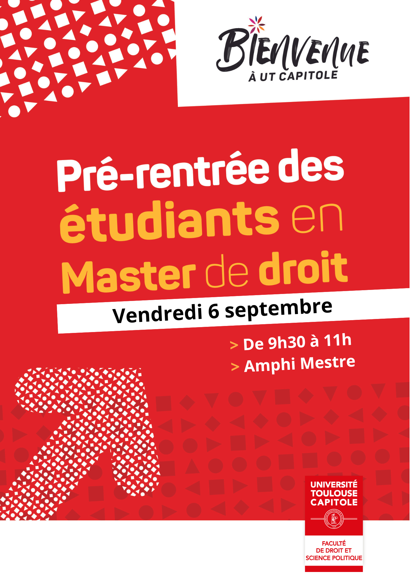 Vous intégrez la Faculté de droit de l'Université Toulouse Capitole en Master de droit à la rentrée 2024-2025 ? Une réunion de pré-rentrée vous est dédiée le vendredi 6 septembre en amphi Mestre.