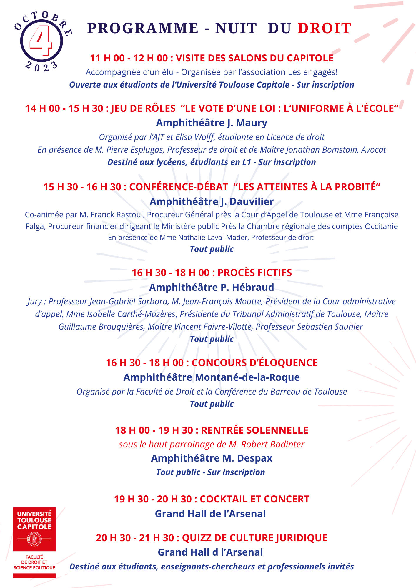 - de 16 h 30 à 18 h 00 : un concours d'éloquence, organisé par la Faculté et la Conférence du barreau de Toulouse ;
