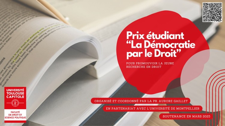 Organisé et coordonné par la Professeure Aurore Gaillet, en partenariat avec la Faculté de Droit de Montpellier (Jordane Arlettaz et Julien Bonnet), le prix étudiant "La Démocratie par le Droit" vise à promouvoir l'intérêt pour la recherche des étudiants de Licence inscrits à la Faculté de Droit de Toulouse.