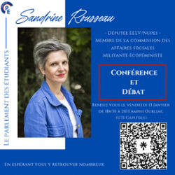 Cette conférence se déroulera le vendredi 13 janvier à partir de 18 heures 30 au sein de l'Université Toulouse Capitole dans l'amphithéâtre Ourliac. Sandrine Rousseau, Députée et femme politique engagée, évoquera son parcours politique et sa vision sur des sujets d'actualité.