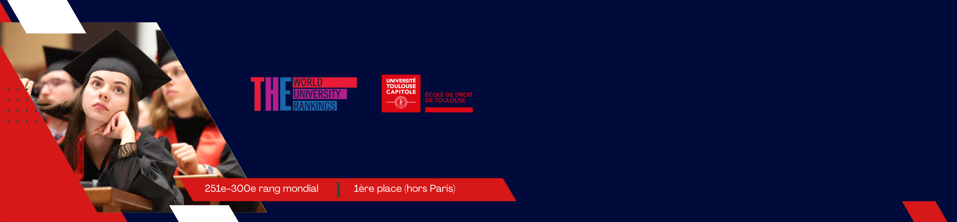 Classée entre le 251e et le 300e rang mondial, l'École de droit de Toulouse se hisse également dans le top 5 des universités françaises en droit et décroche la 1ère place hors Paris.