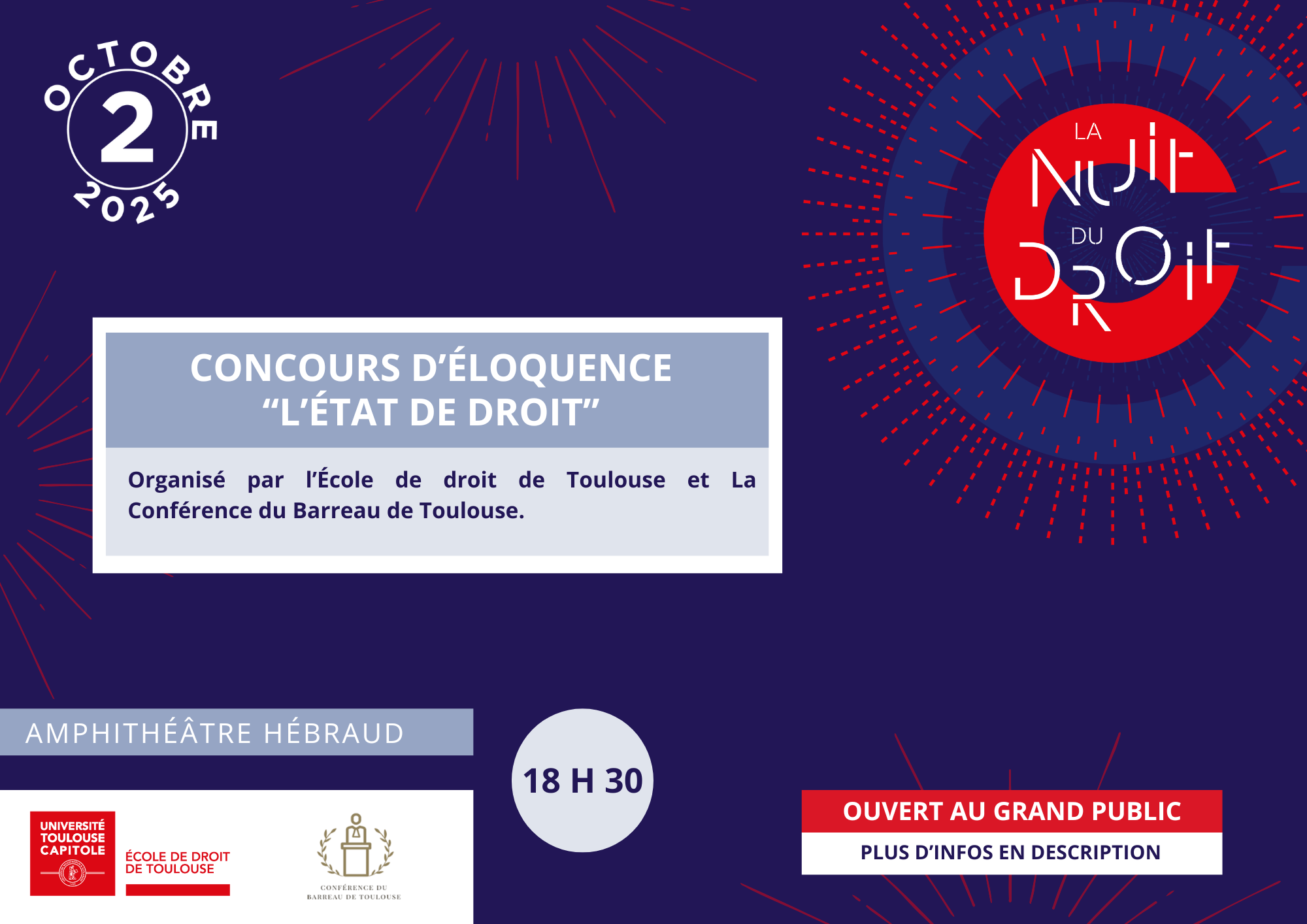 Dans le cadre de la Nuit du Droit, l'École de Droit de Toulouse a organisé un concours d'éloquence, en collaboration avec la Conférence du Barreau de Toulouse. Ce concours d'éloquence portait sur le thème "l'État de droit".