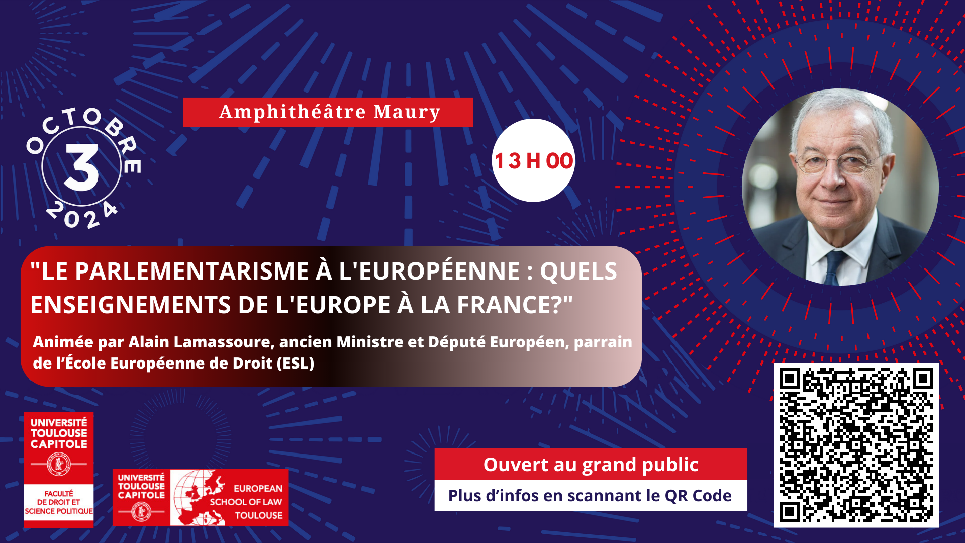 La Faculté de droit de Toulouse et son Ecole européenne de droit (ESL) ont l'immense plaisir d'accueil, le 3 octobre prochain à l'occasion de la Nuit du droit, M. Alain Lamassoure, ancien Ministre et Député Européen, parrain de l’École Européenne de Droit (ESL), sur le thème : "Le parlementarisme à l'européenne: quels enseignements de l'Europe à la France?".