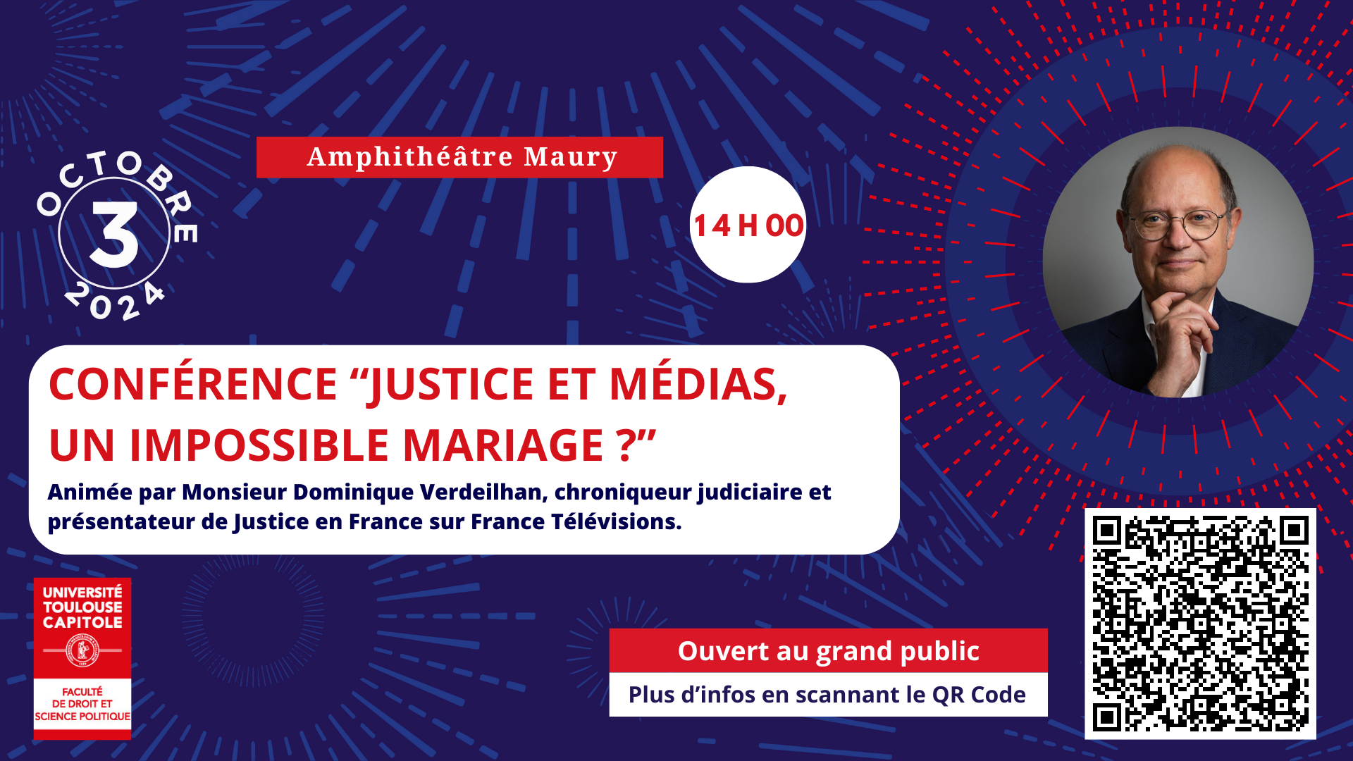 Dans le cadre de la Nuit du Droit 2024 qui se déroulera le 3 octobre prochain, une conférence exceptionnelle de M. Dominique Verdeilhan sera organisée à la Faculté de droit.