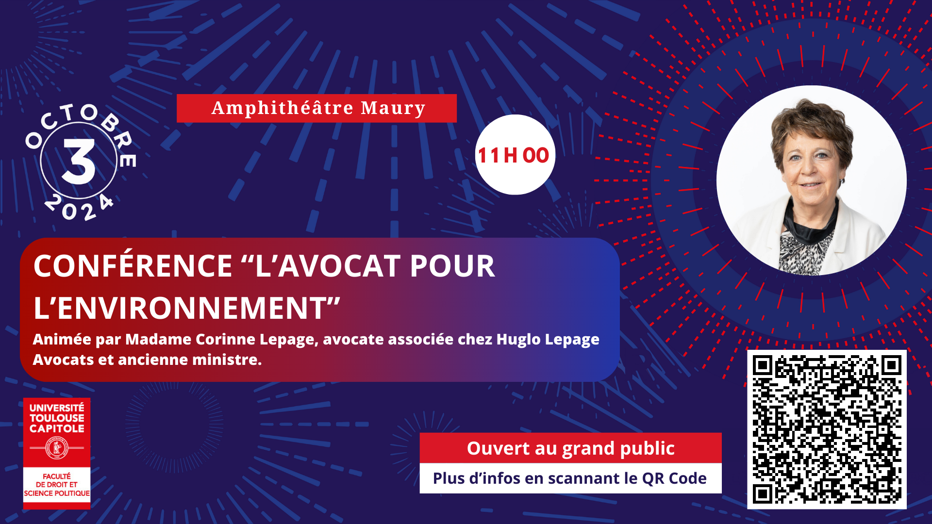 Dans le cadre de la Nuit du Droit 2024 qui se déroulera le 3 octobre prochain, une conférence exceptionnelle de Mme Corinne Lepage sera organisée à la Faculté de droit.
